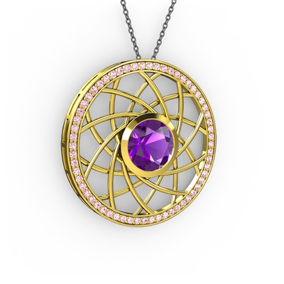 Ametist ve pembe kuvars 8 ayar altın kolye (40 cm gümüş rolo zincir)
