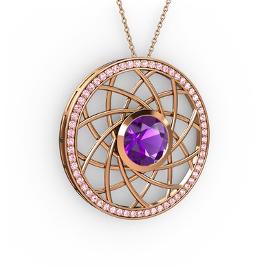 Ametist ve pembe kuvars 8 ayar rose altın kolye (40 cm gümüş rolo zincir)