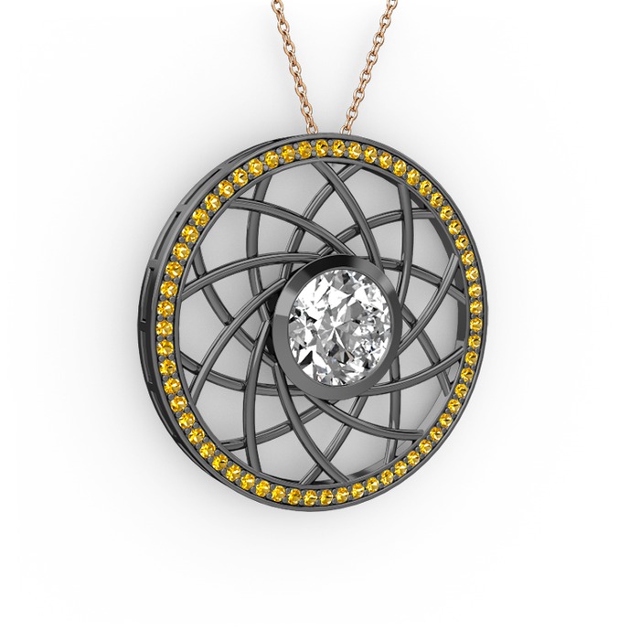 Beyaz zirkon ve sitrin 925 ayar siyah rodyum kaplama gümüş kolye (40 cm rose altın rolo zincir)