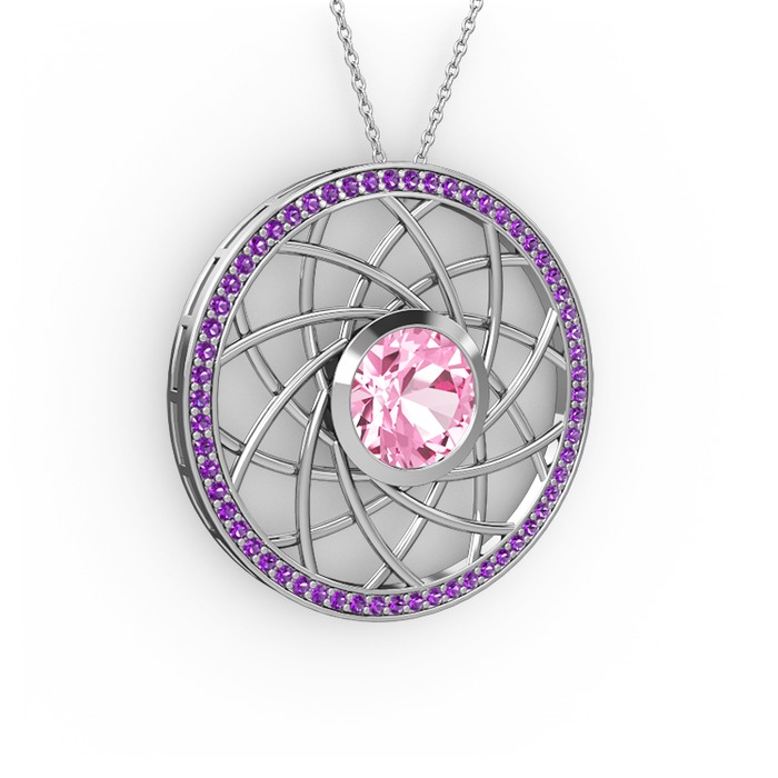 Pembe kuvars ve ametist 8 ayar beyaz altın kolye (40 cm gümüş rolo zincir)
