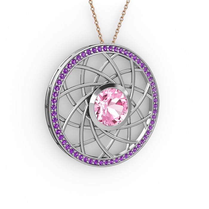 Pembe kuvars ve ametist 8 ayar beyaz altın kolye (40 cm rose altın rolo zincir)