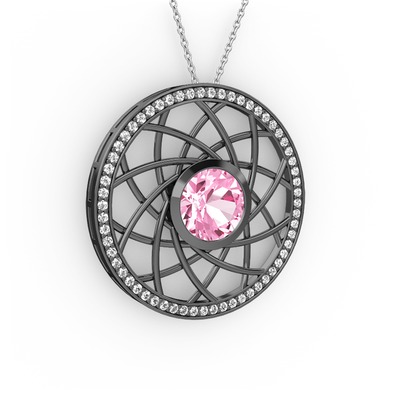 Pembe kuvars ve pırlanta 925 ayar siyah rodyum kaplama gümüş kolye (0.66 karat, 40 cm beyaz altın rolo zincir)