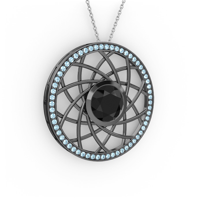 Siyah zirkon ve akuamarin 925 ayar siyah rodyum kaplama gümüş kolye (40 cm beyaz altın rolo zincir)