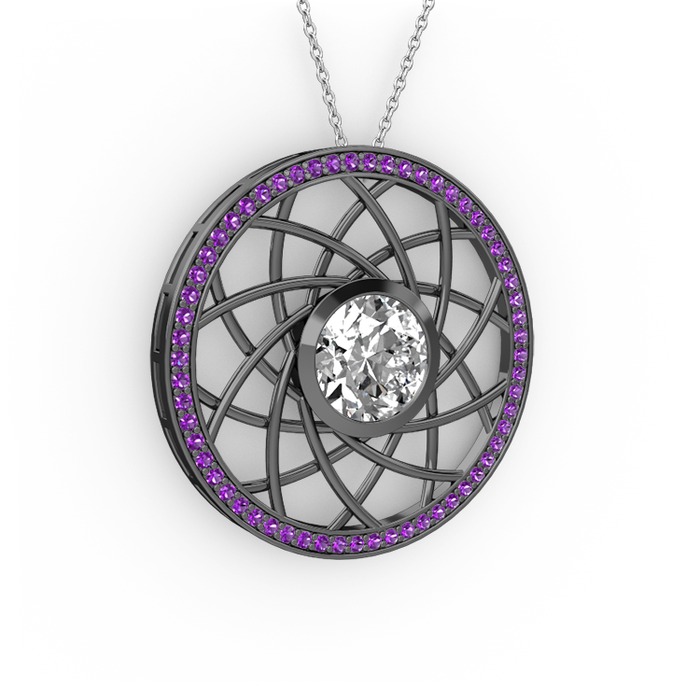 Swarovski ve ametist 925 ayar siyah rodyum kaplama gümüş kolye (40 cm beyaz altın rolo zincir)