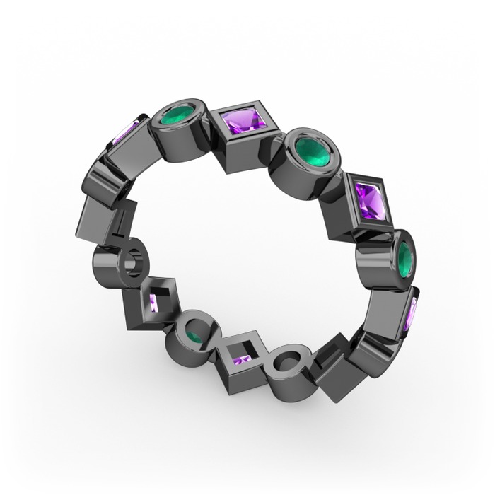 Ametist ve kök zümrüt 925 ayar siyah rodyum kaplama gümüş yüzük