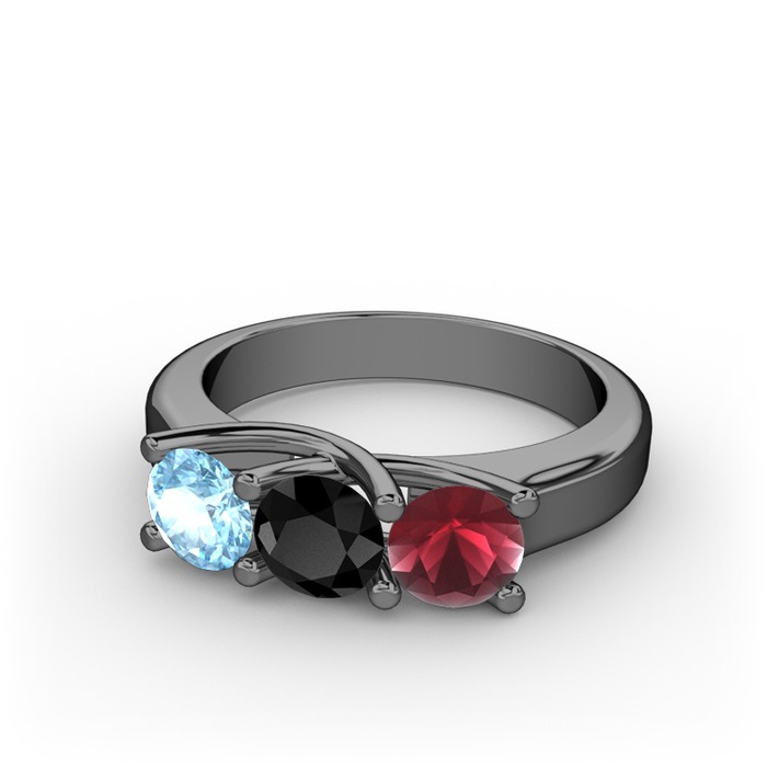 Akuamarin, siyah zirkon ve kök yakut 925 ayar siyah rodyum kaplama gümüş yüzük