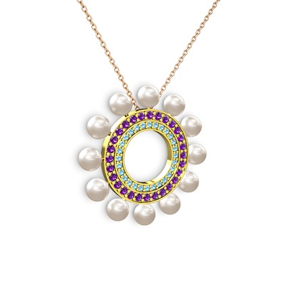 Inci, akuamarin ve ametist 14 ayar altın kolye (40 cm gümüş rolo zincir)