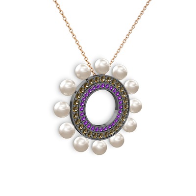 Inci, ametist ve dumanlı kuvars 925 ayar siyah rodyum kaplama gümüş kolye (40 cm rose altın rolo zincir)