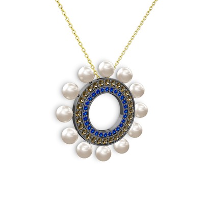 Inci, lab safir ve dumanlı kuvars 925 ayar siyah rodyum kaplama gümüş kolye (40 cm altın rolo zincir)