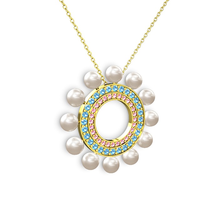 Inci, pembe kuvars ve akuamarin 14 ayar altın kolye (40 cm altın rolo zincir)