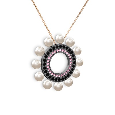 Inci, pembe kuvars ve siyah zirkon 925 ayar siyah rodyum kaplama gümüş kolye (40 cm rose altın rolo zincir)