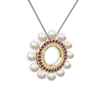 Inci, pırlanta ve ametist 14 ayar altın kolye (0.42 karat, 40 cm gümüş rolo zincir)
