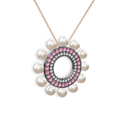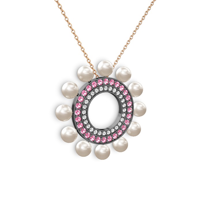 Inci, pırlanta ve pembe kuvars 925 ayar siyah rodyum kaplama gümüş kolye (0.42 karat, 40 cm rose altın rolo zincir)