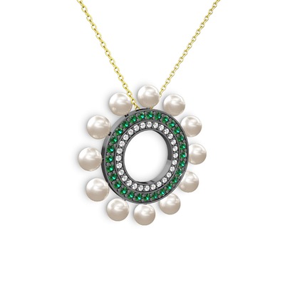 Inci, pırlanta ve yeşil kuvars 925 ayar siyah rodyum kaplama gümüş kolye (0.42 karat, 40 cm gümüş rolo zincir)