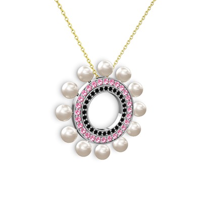 Inci, siyah zirkon ve pembe kuvars 18 ayar beyaz altın kolye (40 cm altın rolo zincir)
