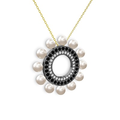 Inci, swarovski ve siyah zirkon 925 ayar siyah rodyum kaplama gümüş kolye (40 cm altın rolo zincir)