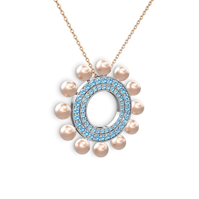 Pembe inci ve akuamarin 18 ayar beyaz altın kolye (40 cm rose altın rolo zincir)
