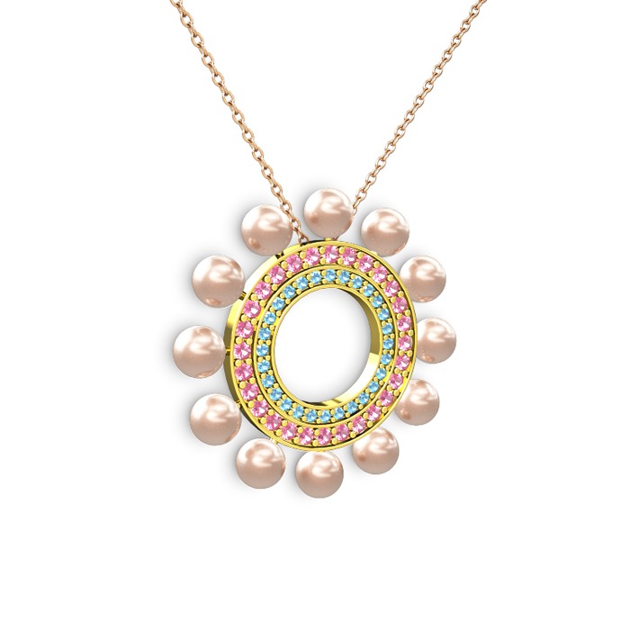 Pembe inci, akuamarin ve pembe kuvars 8 ayar altın kolye (40 cm rose altın rolo zincir)
