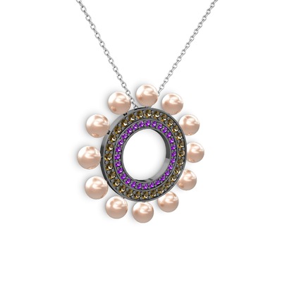 Pembe inci, ametist ve dumanlı kuvars 925 ayar siyah rodyum kaplama gümüş kolye (40 cm beyaz altın rolo zincir)