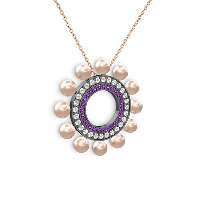 Pembe inci, ametist ve swarovski 925 ayar siyah rodyum kaplama gümüş kolye (40 cm rose altın rolo zincir)