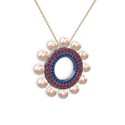 Pembe inci, lab safir ve rodolit garnet 925 ayar siyah rodyum kaplama gümüş kolye (40 cm gümüş rolo zincir)