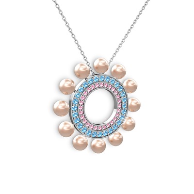 Pembe inci, pembe kuvars ve akuamarin 14 ayar beyaz altın kolye (40 cm beyaz altın rolo zincir)
