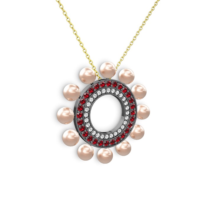 Pembe inci, pırlanta ve garnet 925 ayar siyah rodyum kaplama gümüş kolye (0.42 karat, 40 cm altın rolo zincir)