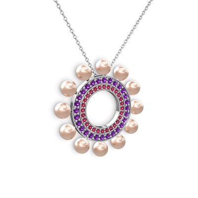 Pembe inci, rodolit garnet ve ametist 18 ayar beyaz altın kolye (40 cm beyaz altın rolo zincir)