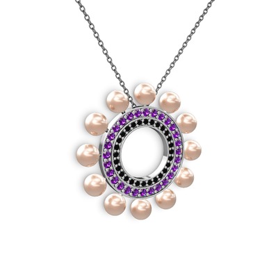 Pembe inci, siyah zirkon ve ametist 14 ayar beyaz altın kolye (40 cm gümüş rolo zincir)