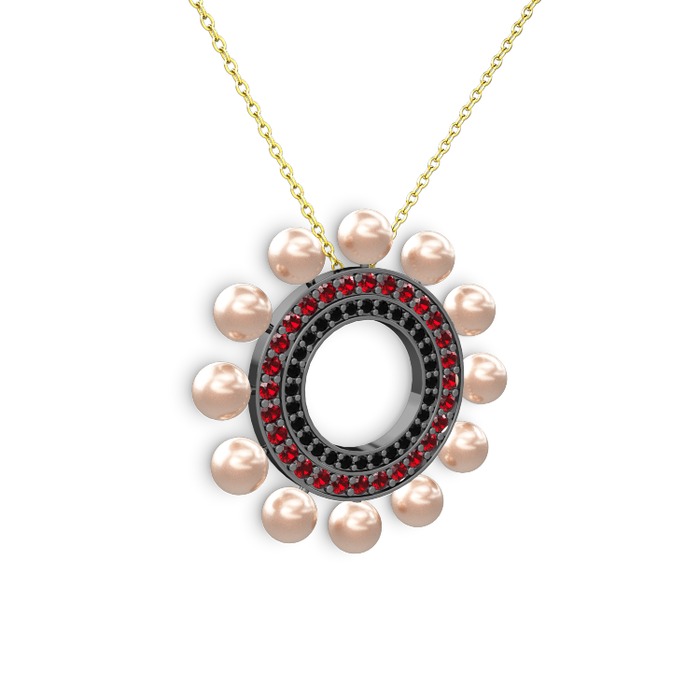 Pembe inci, siyah zirkon ve garnet 925 ayar siyah rodyum kaplama gümüş kolye (40 cm altın rolo zincir)