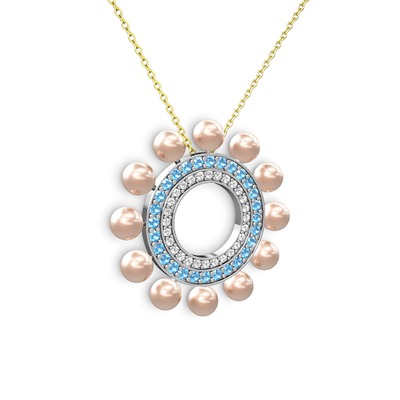 Pembe inci, swarovski ve akuamarin 925 ayar gümüş kolye (40 cm altın rolo zincir)