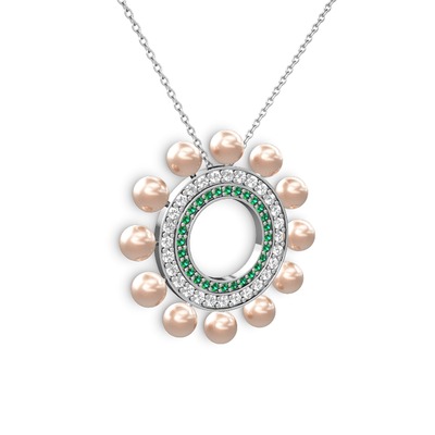 Pembe inci, yeşil kuvars ve pırlanta 18 ayar beyaz altın kolye (0.2464 karat, 40 cm gümüş rolo zincir)