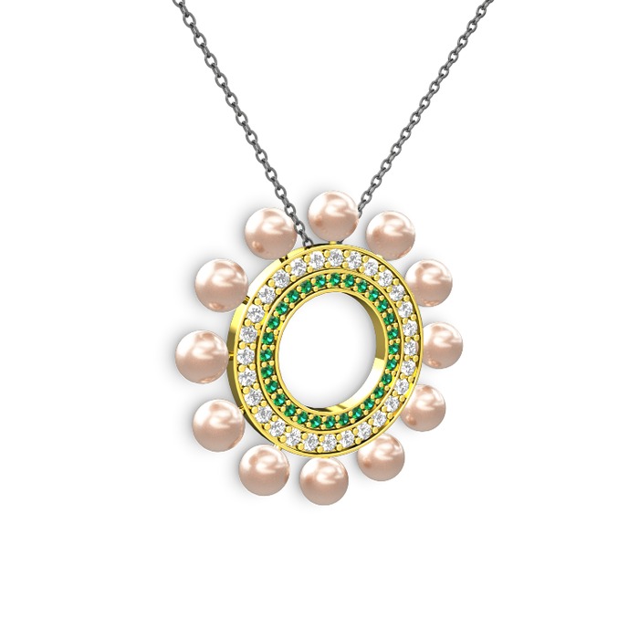 Pembe inci, yeşil kuvars ve pırlanta 8 ayar altın kolye (0.2464 karat, 40 cm gümüş rolo zincir)