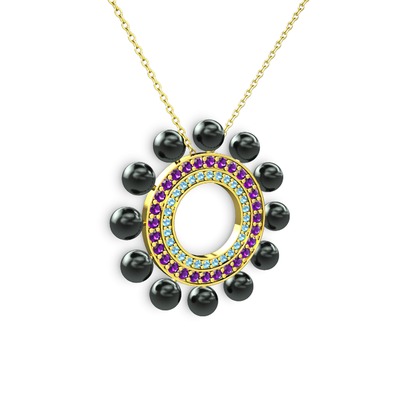 Siyah inci, akuamarin ve ametist 14 ayar altın kolye (40 cm altın rolo zincir)