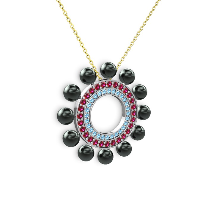 Siyah inci, akuamarin ve rodolit garnet 18 ayar beyaz altın kolye (40 cm altın rolo zincir)
