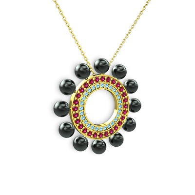 Siyah inci, akuamarin ve rodolit garnet 8 ayar altın kolye (40 cm altın rolo zincir)