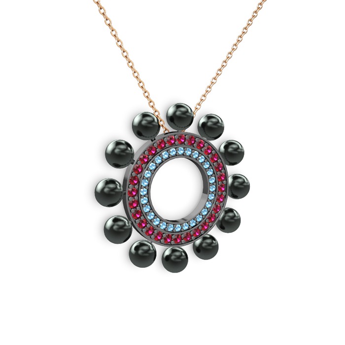 Siyah inci, akuamarin ve rodolit garnet 925 ayar siyah rodyum kaplama gümüş kolye (40 cm gümüş rolo zincir)