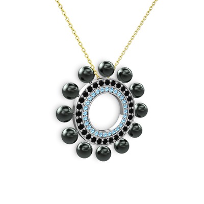 Siyah inci, akuamarin ve siyah zirkon 18 ayar beyaz altın kolye (40 cm altın rolo zincir)