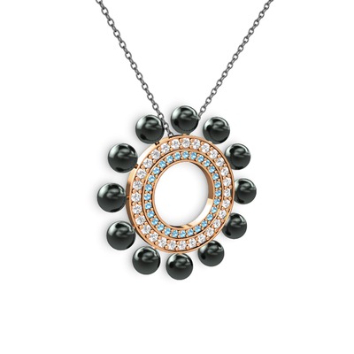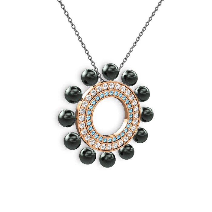 Siyah inci, akuamarin ve swarovski 18 ayar rose altın kolye (40 cm gümüş rolo zincir)