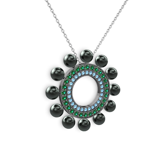 Siyah inci, akuamarin ve yeşil kuvars 925 ayar siyah rodyum kaplama gümüş kolye (40 cm beyaz altın rolo zincir)