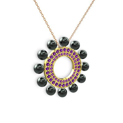 Siyah inci ve ametist 8 ayar altın kolye (40 cm rose altın rolo zincir)