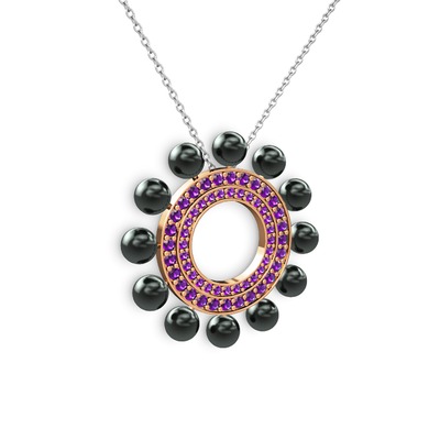 Siyah inci ve ametist 8 ayar rose altın kolye (40 cm beyaz altın rolo zincir)