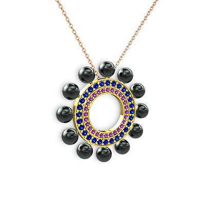Siyah inci, ametist ve lab safir 18 ayar altın kolye (40 cm rose altın rolo zincir)