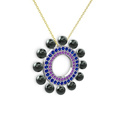 Siyah inci, ametist ve lab safir 925 ayar gümüş kolye (40 cm altın rolo zincir)