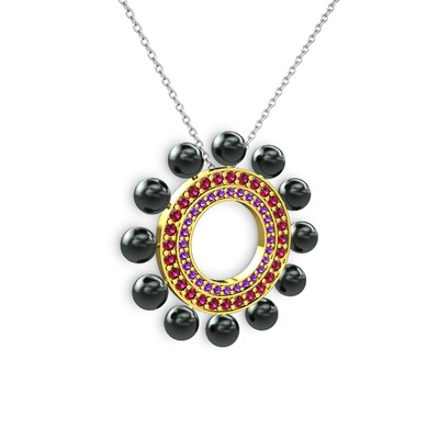 Siyah inci, ametist ve rodolit garnet 18 ayar altın kolye (40 cm gümüş rolo zincir)