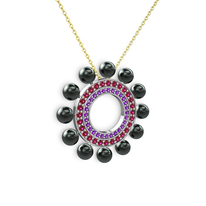 Siyah inci, ametist ve rodolit garnet 18 ayar beyaz altın kolye (40 cm altın rolo zincir)