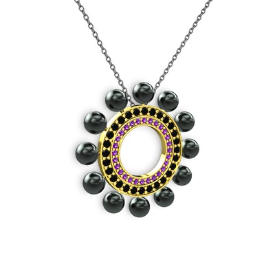 Siyah inci, ametist ve siyah zirkon 18 ayar altın kolye (40 cm gümüş rolo zincir)