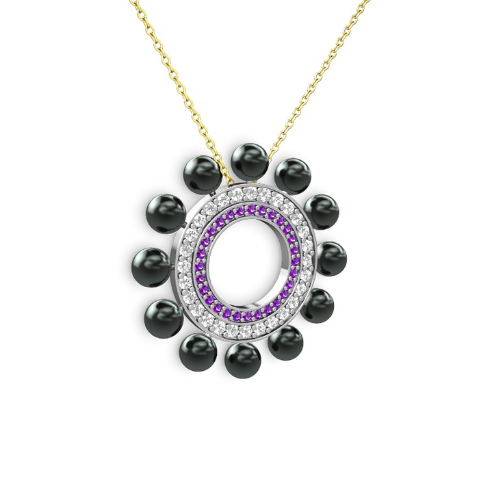 Siyah inci, ametist ve swarovski 8 ayar beyaz altın kolye (40 cm gümüş rolo zincir)