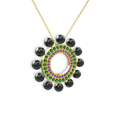 Siyah inci, ametist ve yeşil kuvars 8 ayar altın kolye (40 cm altın rolo zincir)