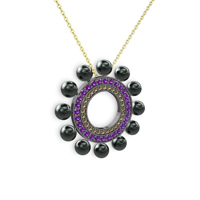 Siyah inci, dumanlı kuvars ve ametist 925 ayar siyah rodyum kaplama gümüş kolye (40 cm altın rolo zincir)